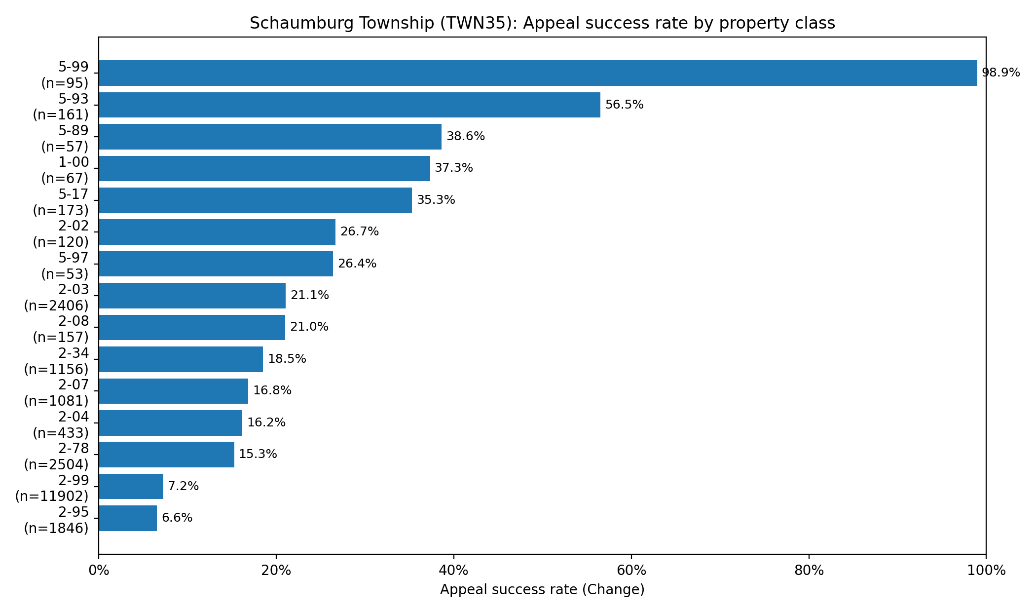 Success rates vary sharply by class. In Schaumburg Township’s 2025 results, the biggest volume classes were residential, while several commercial and industrial classes posted higher success rates (on smaller sample sizes).